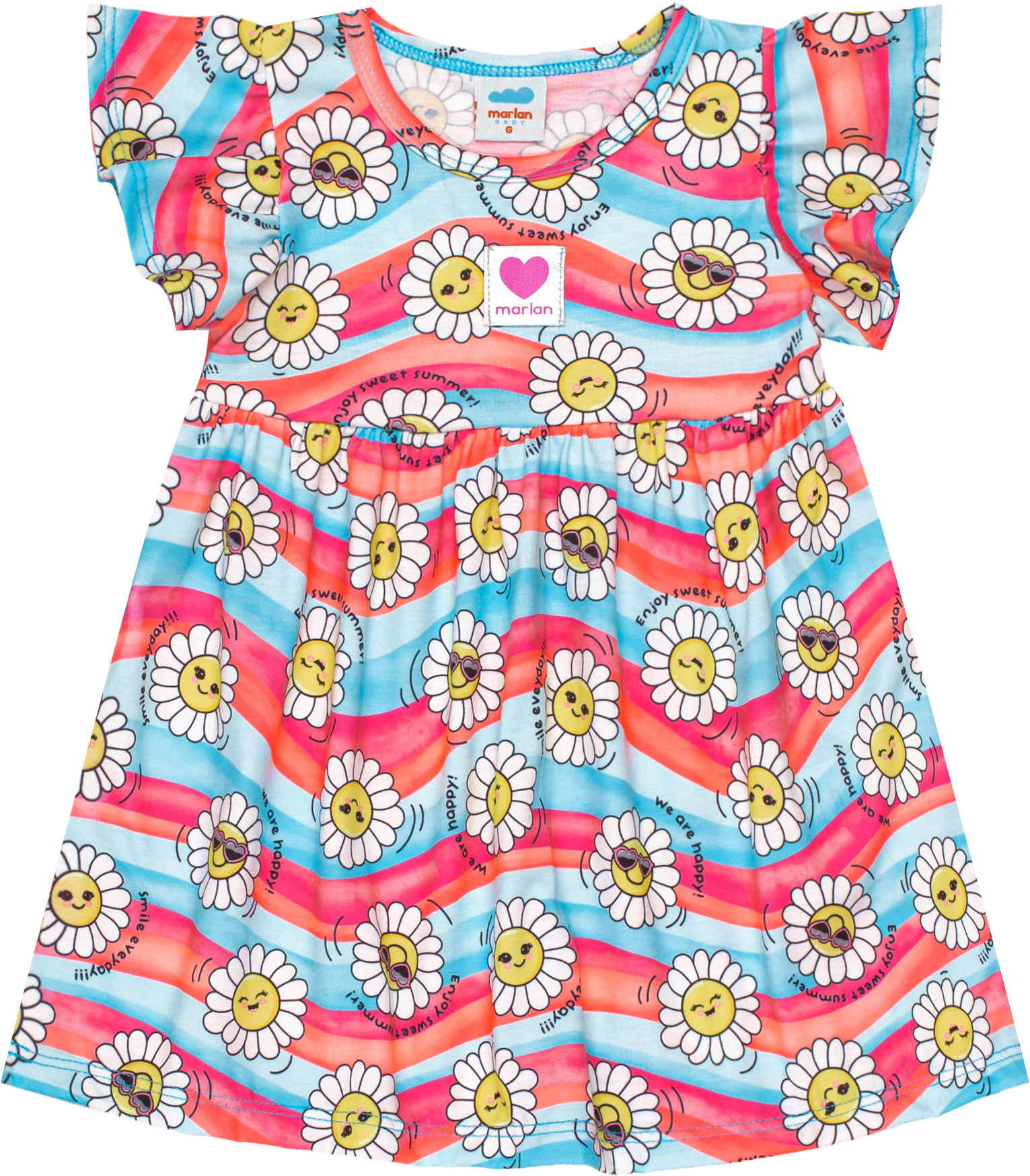 Possui estampa alegre, a manga em formato de babados, ajuste na cintura por elástico além do tecido ser super leve, perfeito para os dias mais quentes.